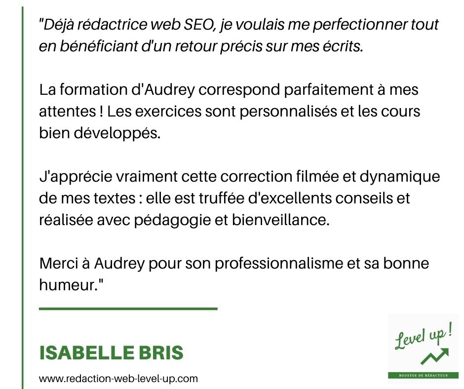Avec Rédaction Web Level Up !, je vous propose une formation en rédaction web SEO, basée sur l'apprentissage par la pratique, un suivi personnalisé et la transmission des clés pour réussir dans le métier.
