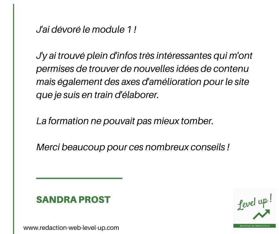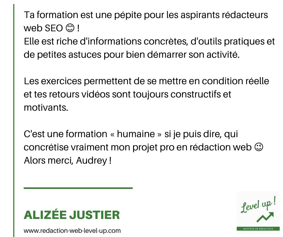 Complète, enrichissante, la formation Rédaction Web Level Up m'a permis de me réconcilier un peu avec le SEO - Oui, nous avions connu un petit froid dernièrement -. Les cours sont parfaitement structurés et vous pouvez naviguer entre le format PDF ou vidéo pour bien saisir l'ensemble des techniques. Ne zappez pas les vidéos, des mines d'astuces et d'informations sont à déguster dans ce format. Les outils proposés sont top et vous saurez parfaitement les utiliser pour rédiger les contenus de qualité qu'attendent vos clients.